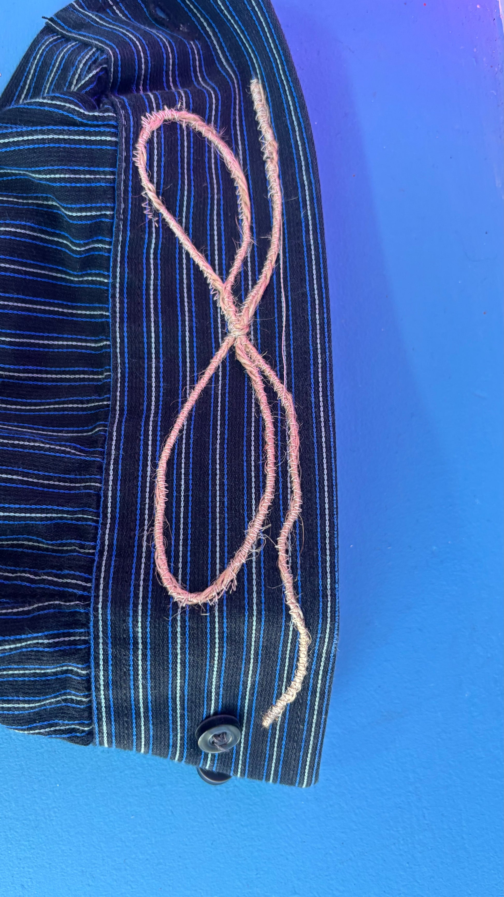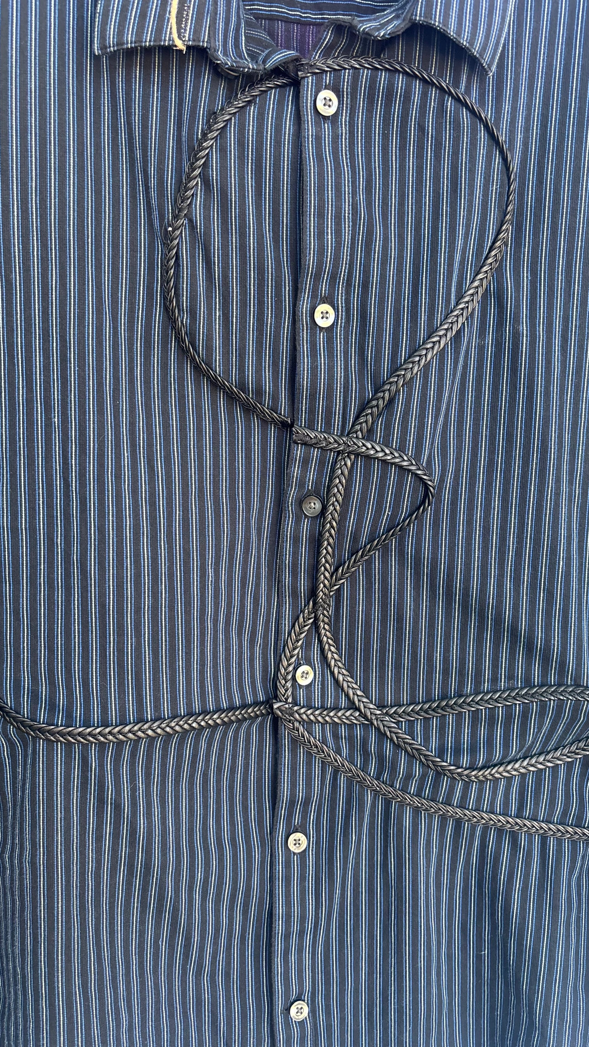 This is a 1 of 1 shirt embroidered with string, leather rope and was custom made by hand for Hollywood actor Luke Madsen.