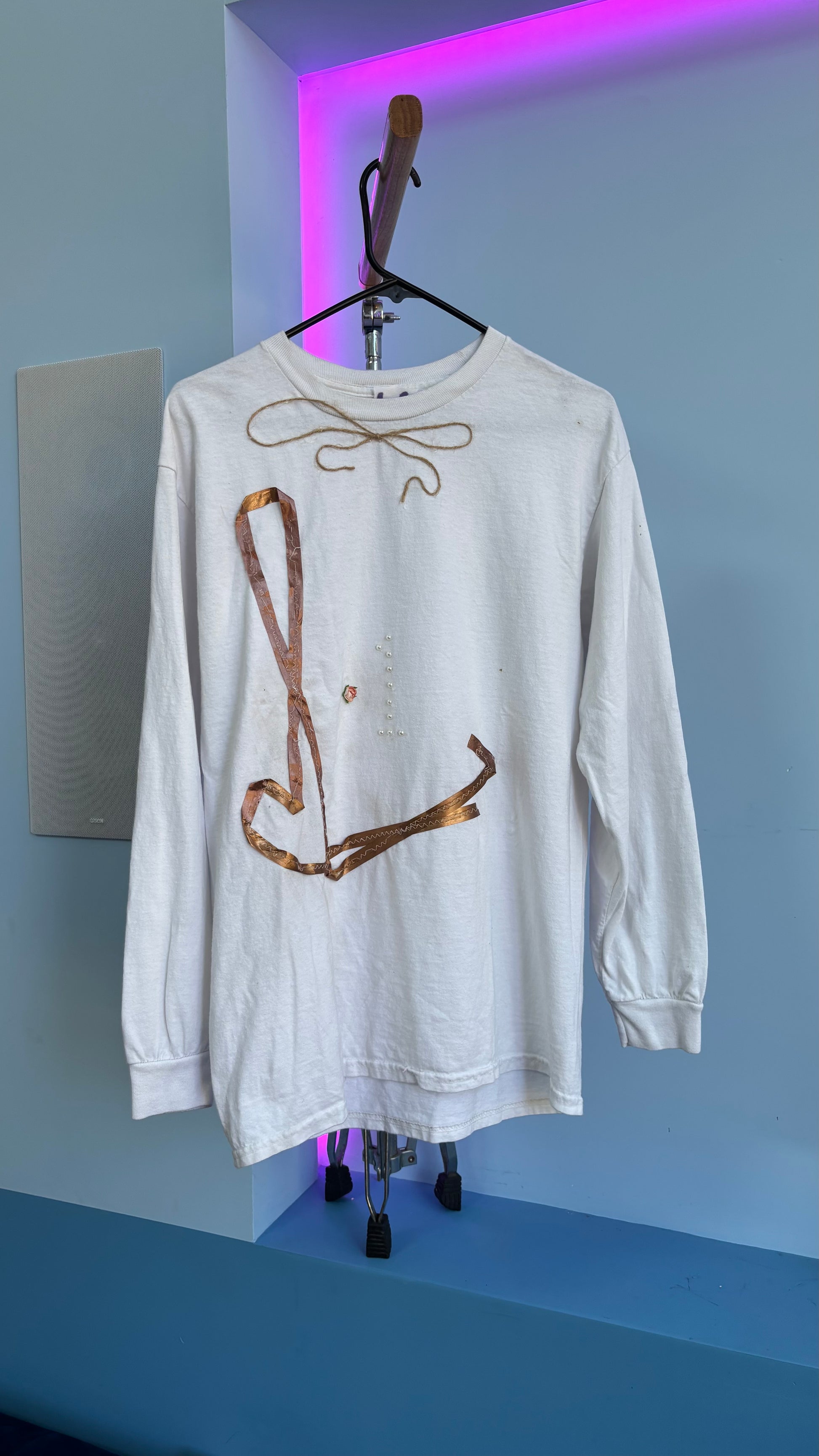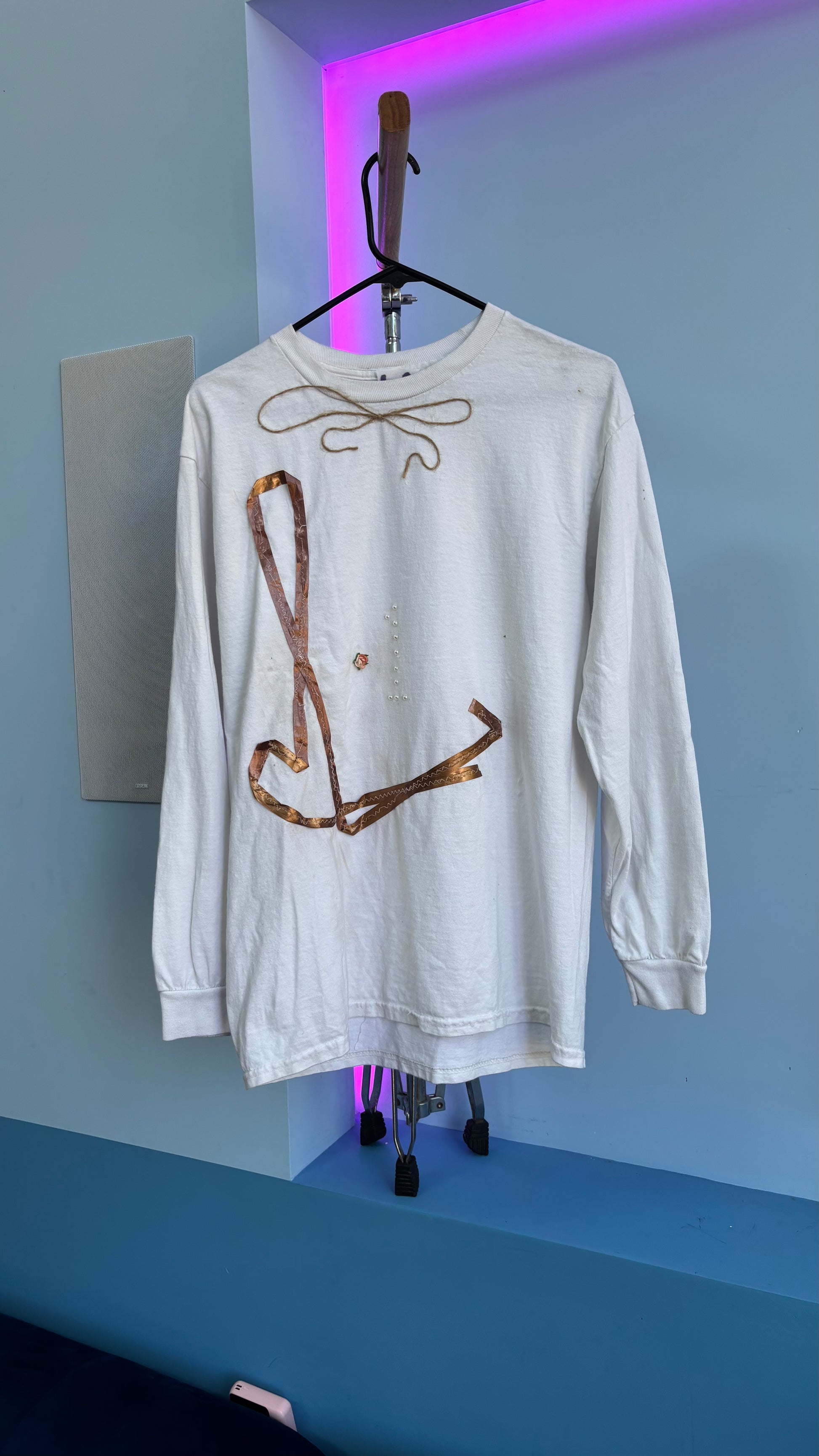 This shirt was crafted with custom sewing stitches as well as a bow tie made from a string, most people wear a bow tie but probably cant afford this t shirt.